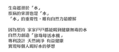 現代人普遍缺鈣,由「自然力國際有限公司」所推出的”真珠Pearl奈米活水機”,獨家的真珠濾心所釋放出鈣離子,並加入奈米天然礦石增強遠紅外線波長,使水分子成為更小分子水,所喝到高氧真珠鈣離子水,不但更好喝且是補充鈣的最佳飲品。